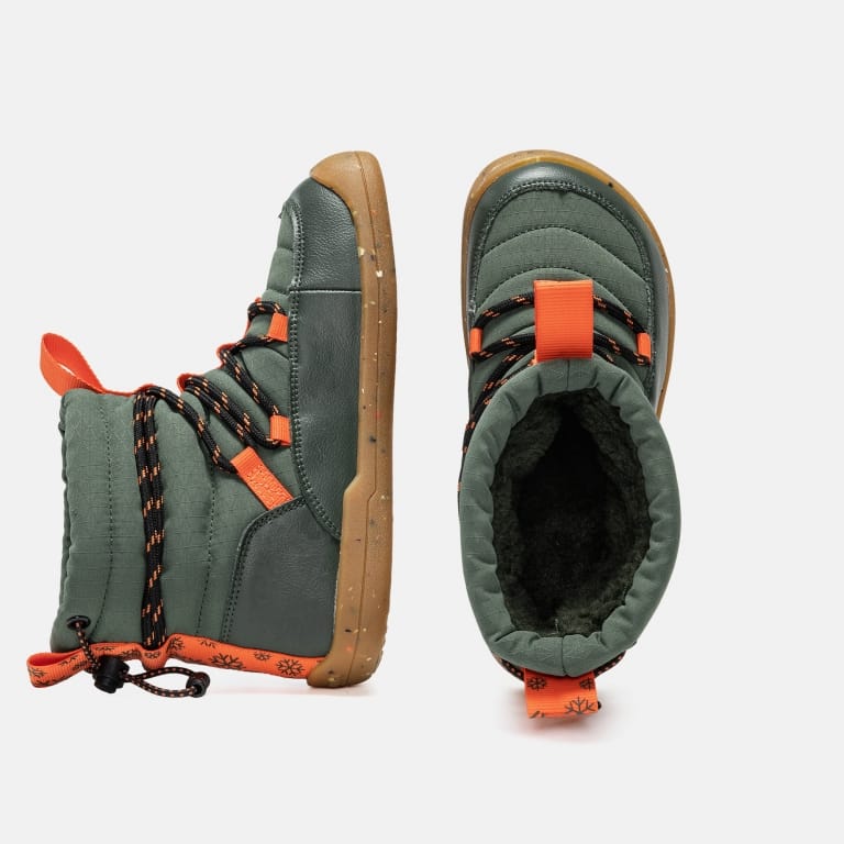 Botas barefoot fabricadas con materiales 100% reciclados, respetando el desarrollo natural del pie y ofreciendo una pisada libre, saludable y cómoda, incluso en los días fríos.