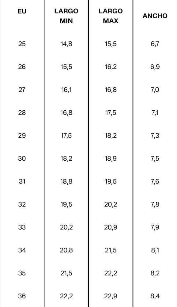 | Talla Niños | 25, 26, 27, 28, 29, 30, 31, 32 |