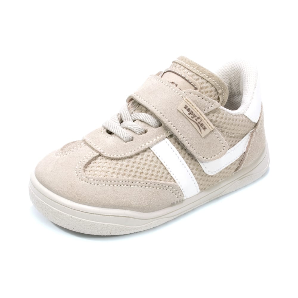 suela plana, fina y extremadamente flexible, que permite una pisada natural. La horma amplia respeta la anatomía del pie, dejando espacio suficiente para que los dedos se muevan libremente y favoreciendo un desarrollo saludable.